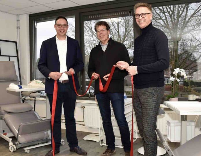Fotobijschrift: Ter gelegenheid van de opening van de thuisdialyselocatie werd geen lint doorgeknipt, maar de initiatiefnemers met elkaar verbonden. Vlnr: huisarts Rob Luijben (huisartsenpraktijk Huijbergen), internist-nefroloog Harmen Krepel (Bravis ziekenhuis) en Filip Luypaert, business unit director renal care Benelux (Baxter).