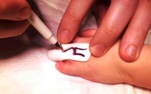 Een volgende stap was de toepassing van 3D-fotografie bij de voorbereiding van een operatie van een jonge patiënt bij wie twee vingers aan elkaar vast zitten.. Van Doorn-Hoevenaren maakte 3D-foto’s van de vergroeide hand. Deze laadde zij in de computer, waarna een chirurg voor de operatie de snijlijnen kon intekenen in de 3D-afbeelding. Vervolgens maakte zij een 3D-print van de hand. Tijdens de operatie was snel en nauwkeurig de snijlijn op de hand van de patiënt in te tekenen (zie figuur).