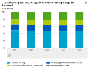 Werknemers in de gezondheids- en welzijnszorg besteedden in het tweede kwartaal van 2025 bijna de helft van hun tijd aan zorg voor, of ondersteuning aan cliënten. Dat meldt het CBS na onderzoek.