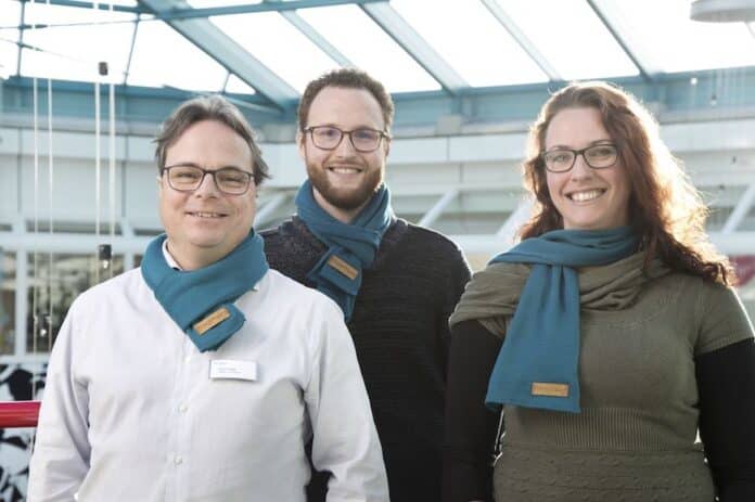 Fotobijschrift: David Post van de raad van bestuur (tevens ambassadeur van het VIPP-programma) poseert trots naast projectleider Ramona Bruins en junior projectleider Cyril Roels na de tweede succesvolle VIPP-audit. (N.B. foto is ook op te vragen als zwaarder bestand) (Foto:Bianca Verhoef Fotografie)