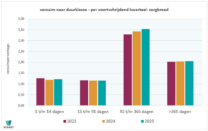 De stijging van het totale verzuim in 2025 wordt volledig verklaard door het langdurig verzuim. In de duurklasse 92 tot en met 365 dagen is het verzuim verder toegenomen. Deze categorie heeft het grootste aandeel in het totale verzuim en is nog nooit zo hoog geweest. Ook het extra langdurig verzuim (366 tot en met 730 dagen) blijft stijgen.