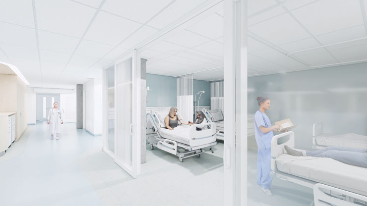 Ook voor de zorgprofessionals is er volop aandacht. In het ontwerp staan welzijn en werkplezier voorop: heldere looproutes, overzichtelijke indeling en veel ruimte voor ontmoeting maken samenwerken eenvoudiger én veiliger. De “off-stage” personeelsruimtes zijn ontworpen met veel daglicht en uitzicht, zodat medewerkers kunnen opladen, bijpraten en ontspannen. Zo’n prettige plek is juist van belang in een verantwoordelijke en intensieve werkomgeving.
