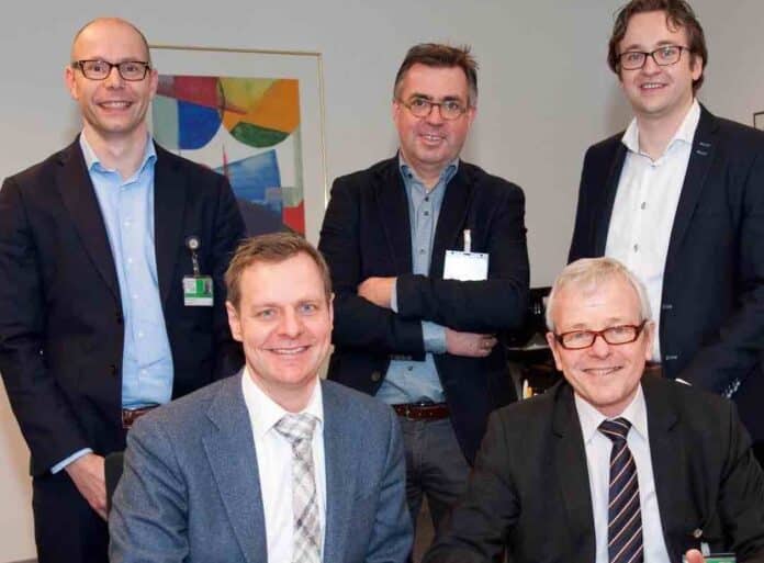 Foto (Ziekenhuis Gelderse Vallei): Arno Uiterweerd (l.), directeur BAM Bouw en Techniek-regio Oost en Dik van Starkenburg (r.), voorzitter Raad van Bestuur van Ziekenhuis Gelderse Vallei ondertekenen het bouwcontract in aanwezigheid van Theo Spoelstra, bouwmanager, Wessel Griffioen, directeur facilitair bedrijf en Harry van Dam, manager planontwikkeling van BAM. (foto: Ernst-Jan Brouwer).