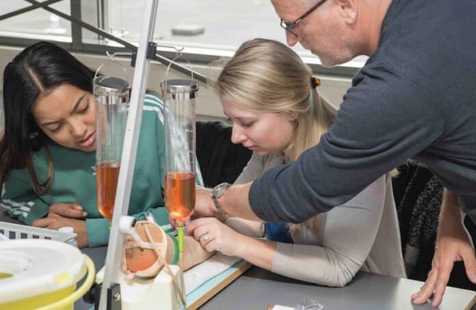 Fotobijschrift: De verpleegkundigen Muriël Kromodikoro (l.) en Amanda Mostert volgen in het Leerhuis van het ETZ een training ‘voorbehouden handelingen’. Opleidingsadviseur Frits van Beers geeft uitleg. (Foto: ETZ Film & Fotografie)
